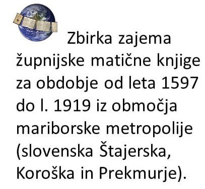 Zbirka zajema župnijske matične knjige za obdobje dobrih 300 let od leta 1597 do l. 1919 iz območja mariborske metropolije – torej celotne severovzhodne Slovenije (slovenska Štajerska, Koroška in Prekmurje). Raziščete lahko 4.556 enot matičnega gradiva (krstnih, poročnih, mrliških knjig in indeksov) oziroma pogledate dobrih pol milijona posnetkov iz originalnih knjig (natančno 531.291).